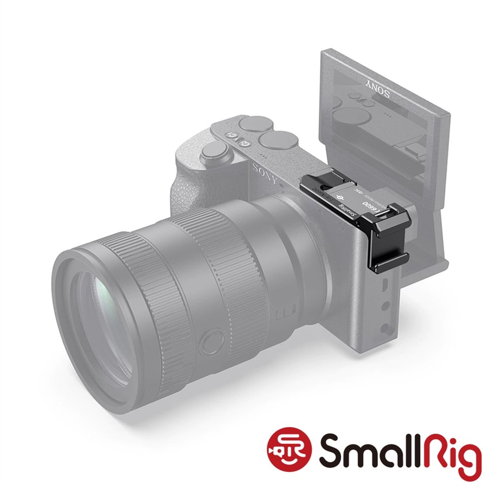 2. 將相機熱靴接口再定位至左側,外接麥克風等冷靴配件的同時完美避開Sony A6600的翻轉屏;