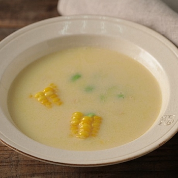 GREEN & SAFE 特製玉米濃湯,選用甜玉米、洋蔥、馬鈴薯及鮮奶熬製濃稠、不加修飾澱粉製作,且用新鮮牛奶熬煮,為使口感更多層次特別加入柴窯煙燻香草培根及毛豆仁增加風味,使碗小朋友會喜歡大人又安心的健康濃湯。