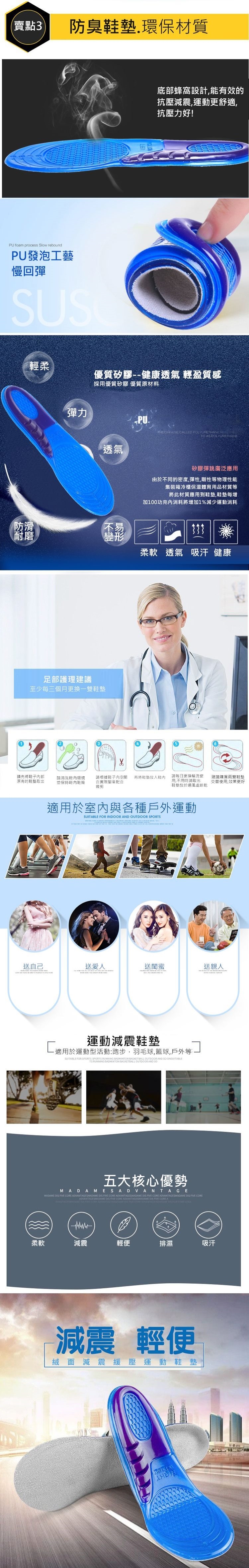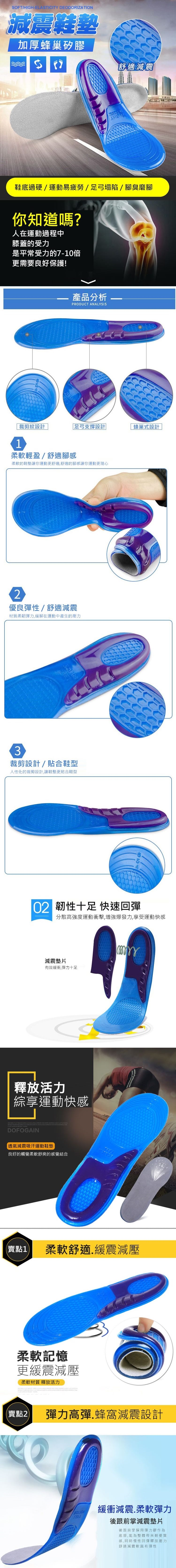 全新升級的 加厚蜂巢矽膠減震鞋墊 蜂窩狀特殊軟膠體設計。