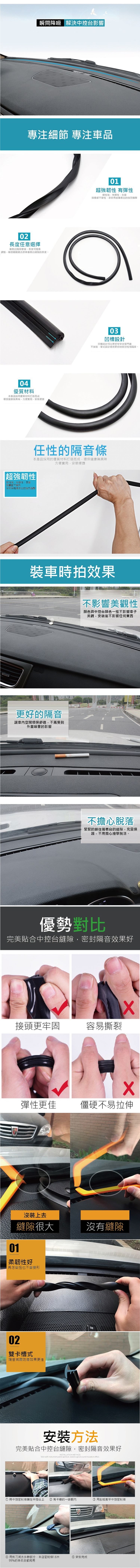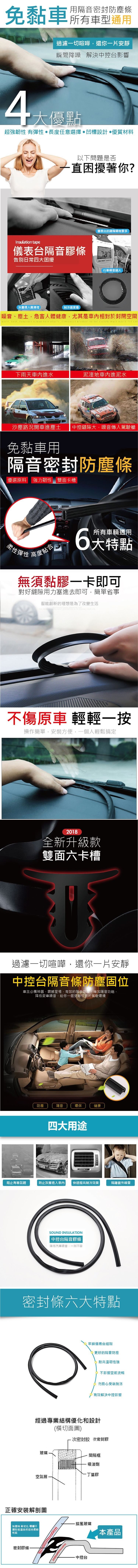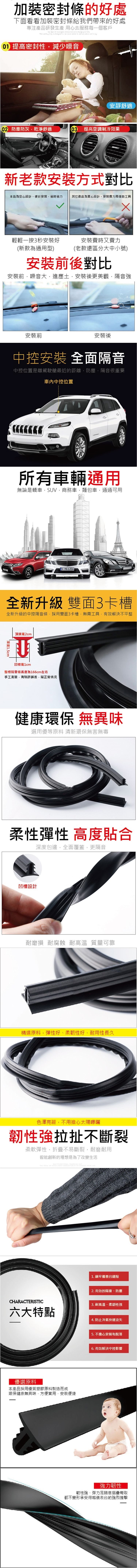 車內常常容易產生灰塵?車窗都關起來郤還是聽到車外的吵雜聲?免黏車用隔音防塵密封條解決您的困擾,最新款的雙面三卡槽式,免黏按壓式,不需任何工具即可完成安裝,隔音防塵一次完成,大大減少您車內灰塵的產生及再也不用為那些不可拒絕的車外吵雜聲所干擾囉