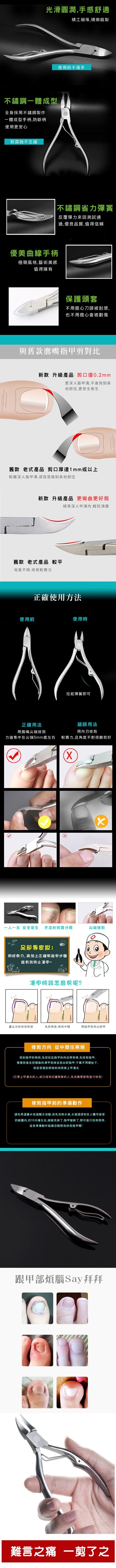 指甲嵌進肉裡的痛苦難以忍受?難言之痛,要靠加長款專業鷹嘴甲溝鉗剪指甲刀,一剪了之!傳統指甲刀既剪不乾淨又容易受傷,這把腳趾專用修甲刀,好拿好握,輕鬆解決各種問題!不鏽鋼打造,鷹嘴更彎、更尖、更鋒利,能深入甲溝,去除死皮,讓你修剪更便利!
