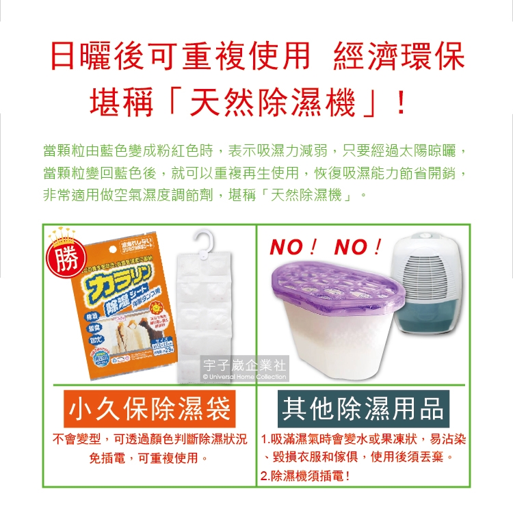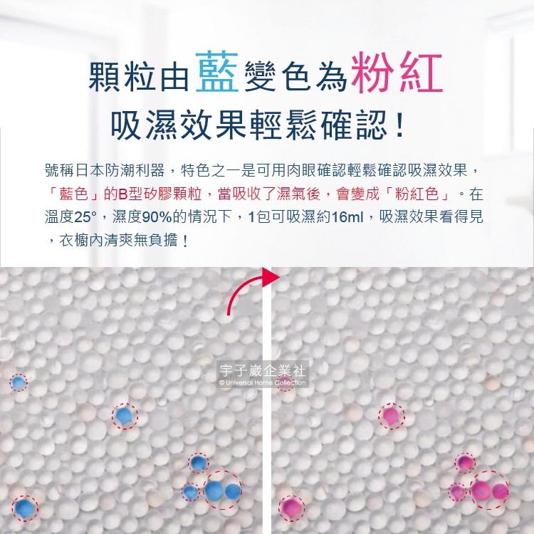 3.若除濕袋中的藍色顆粒變成粉紅色,代表吸濕能力減弱,請曝曬至顆粒變回藍色之後,即可恢復使用。