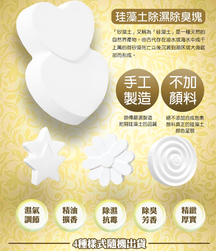 來自大自然的能量與芬芳,源自法國天然調配,堅持給您最佳品質~師傅嚴選製造,把關珪藻土的品質!絕不添加合成色素,呈現真正珪藻土顏色,安全無毒~多款香味任選,除濕除臭,還可當作擺飾,美化環境!