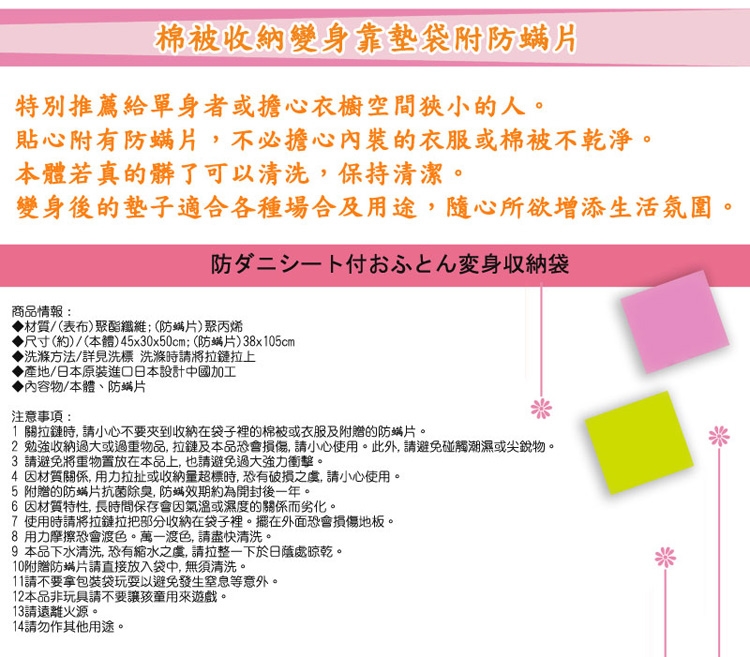 注意事項: 1 關拉鏈時,請小心不要夾到收納在袋子裡的棉被或衣服及附贈的防螨片。