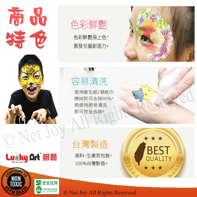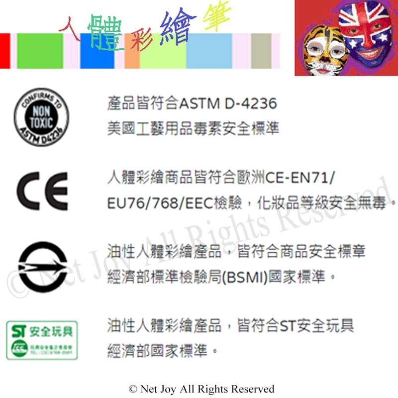 好畫,易擦的人體彩繪顏料,產品皆符安全無毒。通過符合美國ASTM D-4236美國工藝用品毒素安全標準,人體彩繪商品皆符合歐洲CE-EN71/EU76/768/EEC檢驗,化妝品等級安全無毒。油性人體彩繪產品,皆符合商品安全標章經濟部標準檢驗局(BSMI)國家標準。油性人體彩繪產品,皆符合ST安全玩具經濟部國家標準。多重檢驗敬請安心使用。