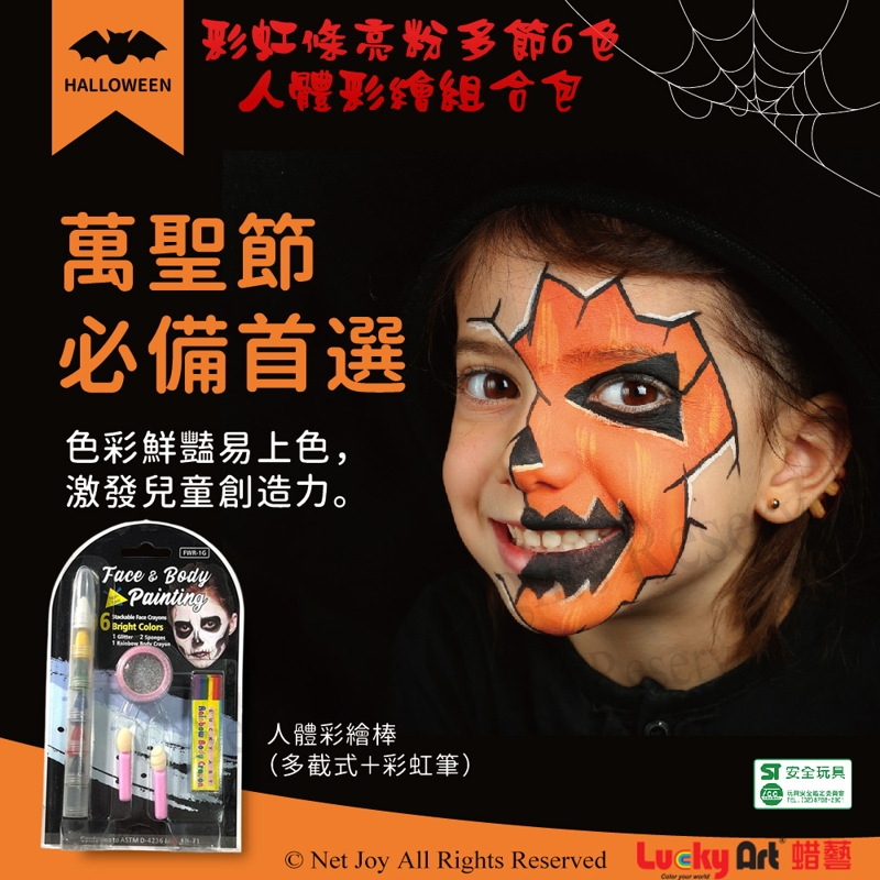 《彩虹條亮粉多節6色人體彩繪組合包》,萬聖節、聖誕節、生日化妝舞會的必備品,保證讓您成為Party上最亮眼的主角喔!不論是畫在臉上、手上、腳上,效果都很棒喔!特殊的彩繪效果,讓您恣意盡情發揮創意,親子共樂一起當個彩繪魔法師吧!此商品更通過歐盟EN71美國ASTM安全檢驗認證,無毒、無害,讓爸爸媽媽可以安心選購喔!!