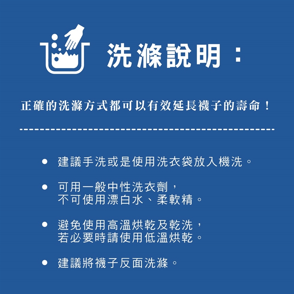 洗滌方式:1.建議將襪子反面洗滌 2.不可使用漂白水及柔軟精 3.若要使用洗衣機清洗請將襪子放入洗衣袋