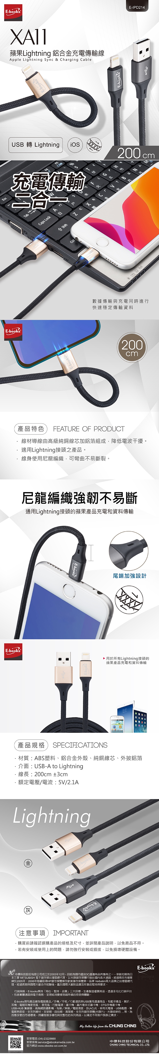 E-books XA11 蘋果Lightning 鋁合金充電傳輸線2M