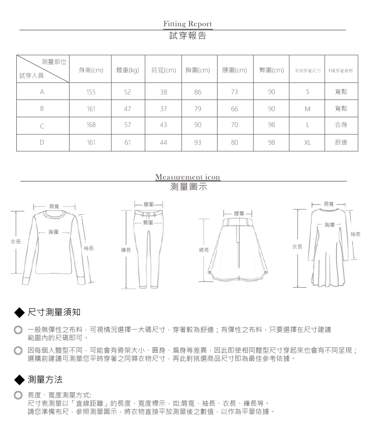 * 因衣物有彈性,可能因測量方式不同而與標示略有差距,誤差1~3cm以內為正常範圍。