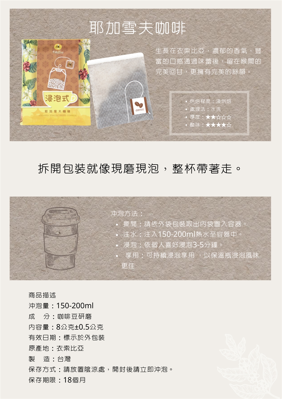 熱泡 : 加入熱水約150~200ml,靜置3~5分鐘後,再將咖啡包上下吊動數次即可