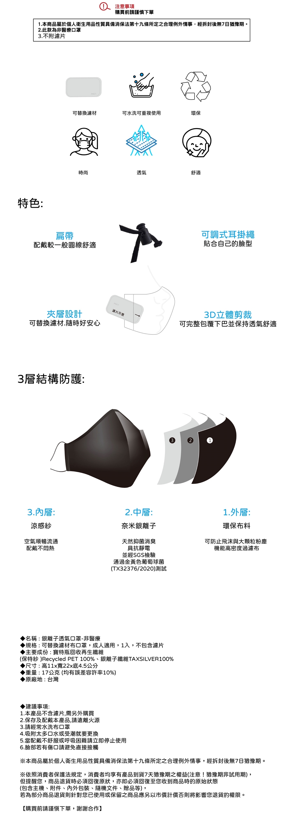 商品詳細介紹 使用方法說明 使用前建議先清洗 注意事項 1.本產品不含濾片,需另外購買2.保存及配戴本產品,請遠離火源3.請經常水洗布口罩4.吸附太多口水或受潮就要更換5.當配戴不舒服或呼吸困難請立即停止使用6.臉部若有傷口請避免直接接觸※本商品屬於個人衛生用品性質具備消保法第十九條所定之合理例外情事,經拆封後無7日猶豫期。