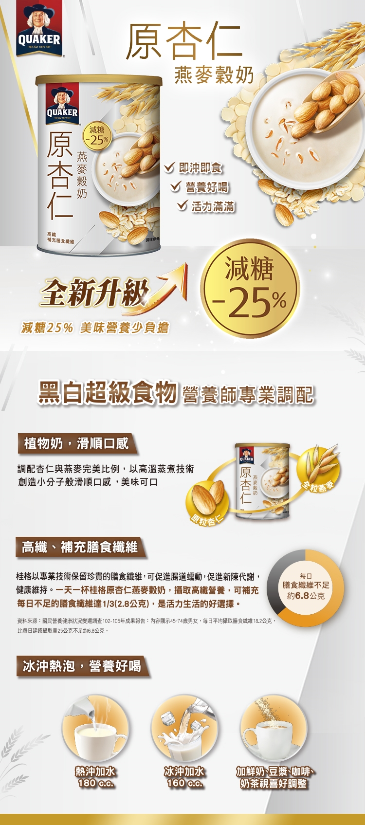 4.內容物名稱(成分):杏仁燕麥穀奶(杏仁、米、小麥纖維、乳清粉、燕麥)、麥芽糊精、蔗糖、非氫化棕櫚仁油、大豆蛋白、馬鈴薯粉、香料、關華豆膠。 本產品含有堅果類、含麩質之穀物、牛奶、大豆。