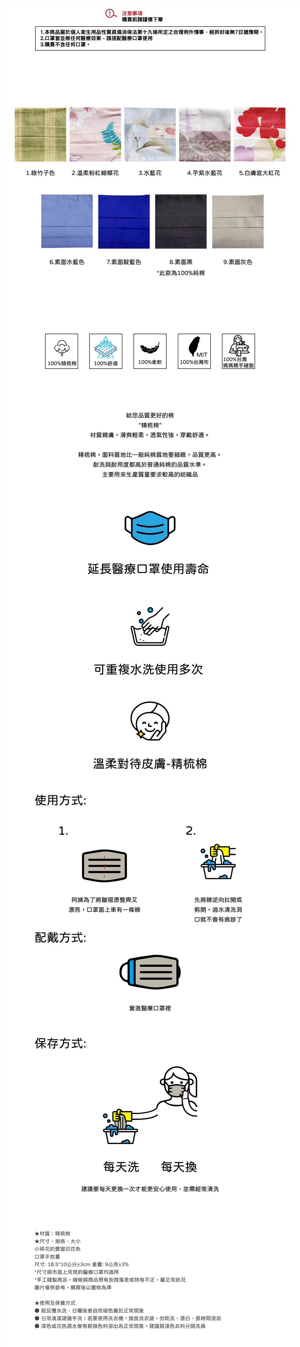 商品詳細介紹 使用方法說明 ● 經反覆水洗、日曬後會自然褪色屬於正常現象● 日常清潔建議手洗;若要使用洗衣機,請放洗衣袋,勿乾洗、漂白、長時間浸泡● 深色或花色遇水會有輕微色料溶出為正常現象,建議與淺色衣料分開洗滌 注意事項 ★口罩類屬於個人衛生用品,衛生問題只要購買拆封就不能退換貨★