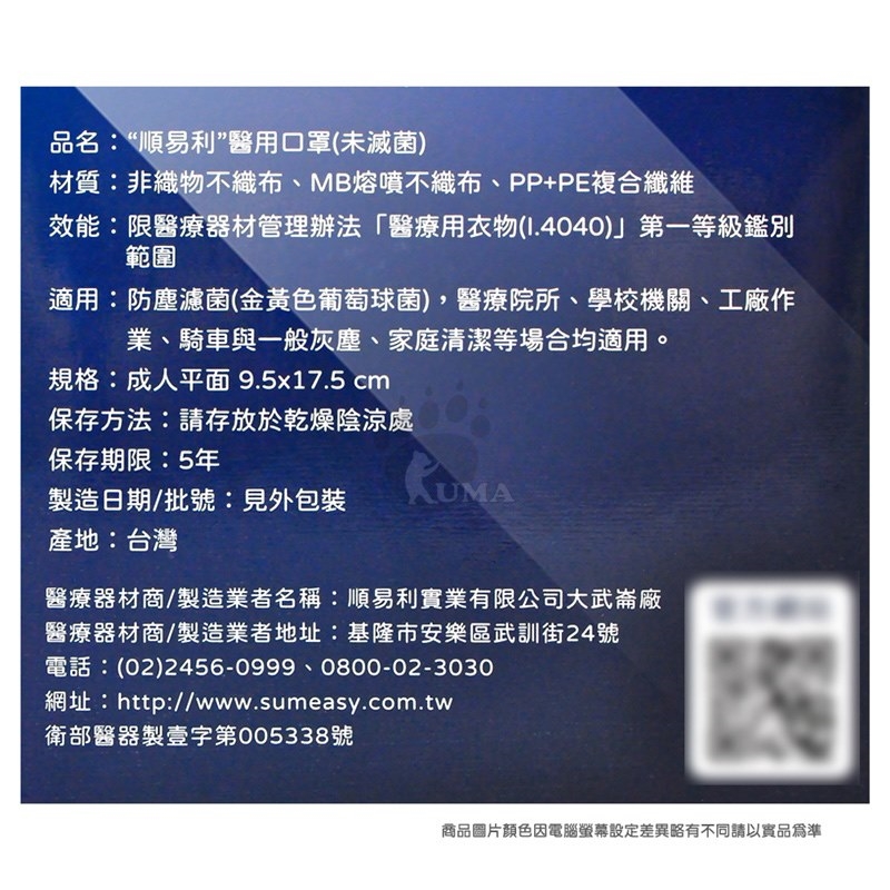 *商品品名:“順易利” 醫用口罩 (未滅菌)