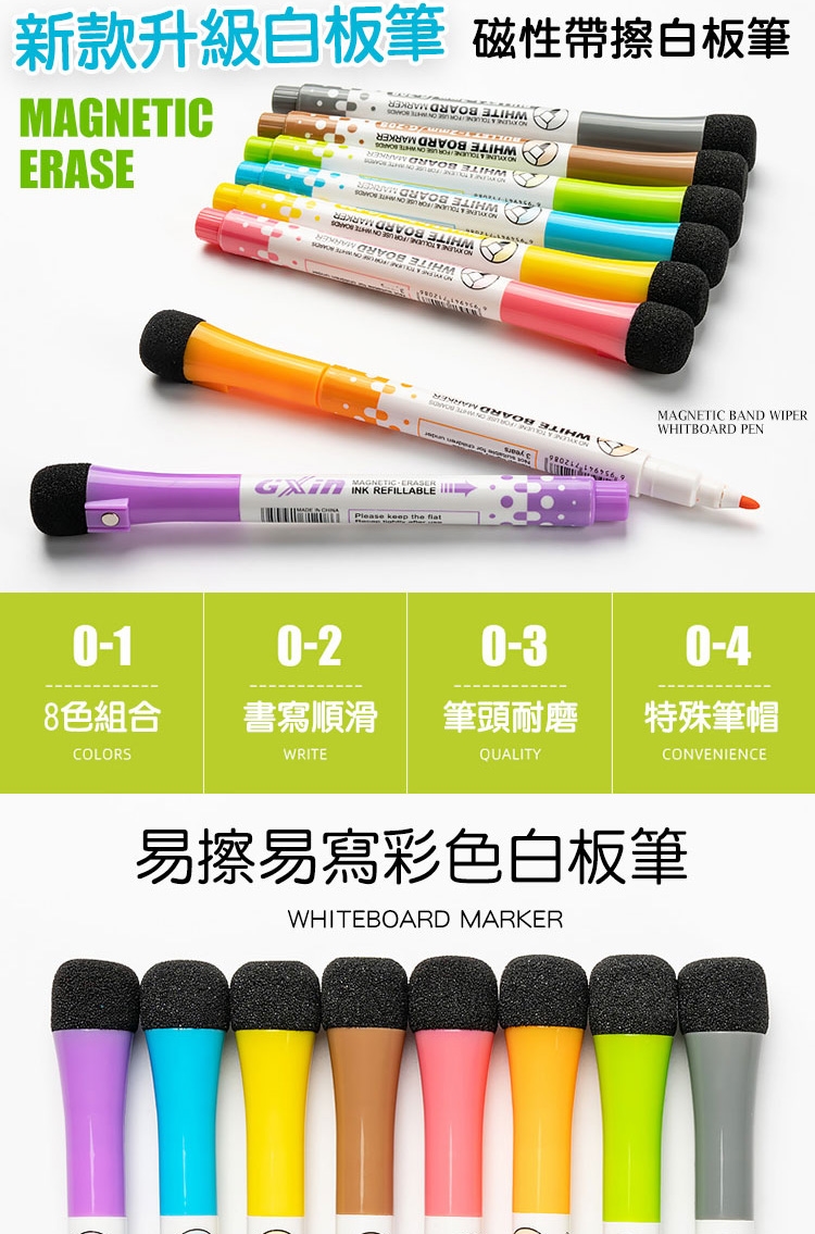 新款升級版白板筆8入組,筆尖選用纖維筆頭不易變形