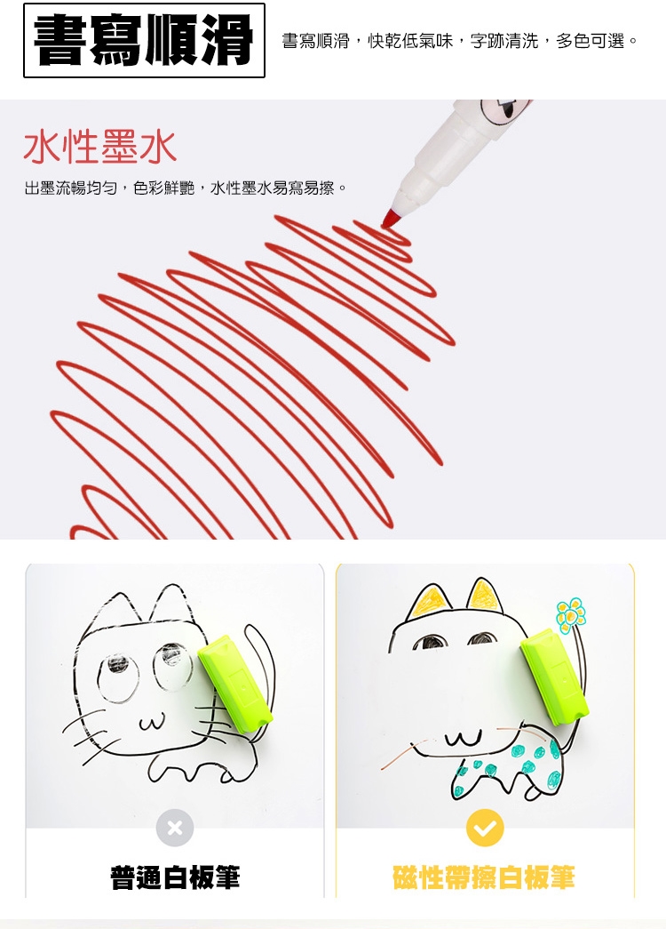 附有磁鐵可直接吸附白板上,白板筆在白板上不會找不到