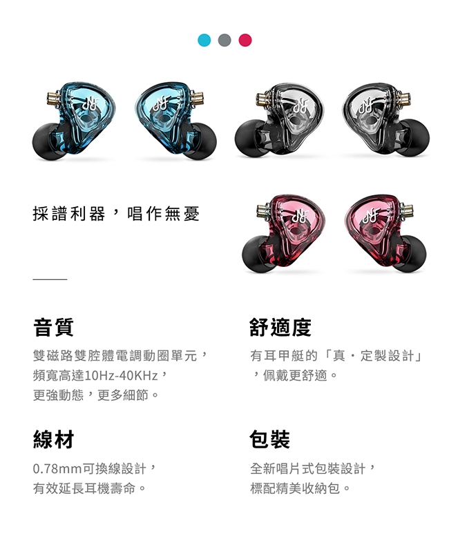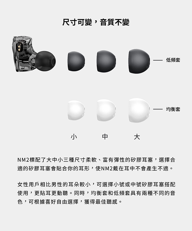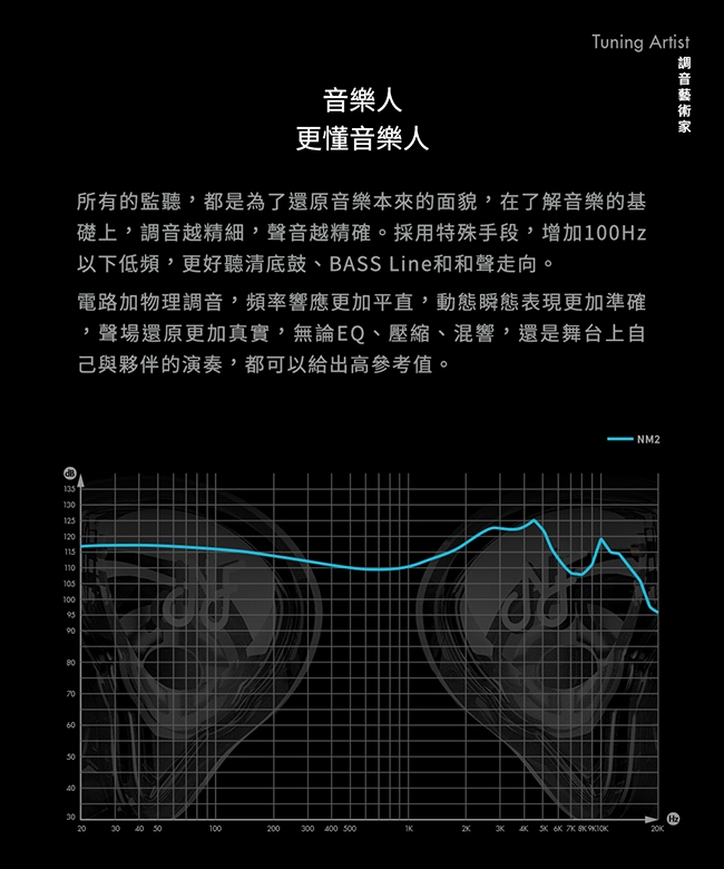NM2 採用雙磁路雙腔體電調動圈單元,頻寬高達10Hz-40KHz,
