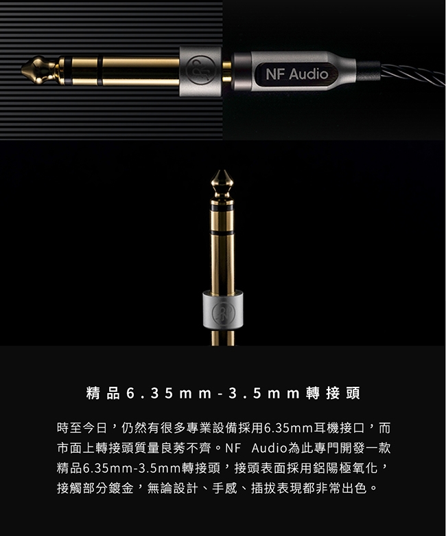 配備6.35mm-3.5mm轉接頭,接頭表面採用鋁陽極氧化,接觸部分鍍金,