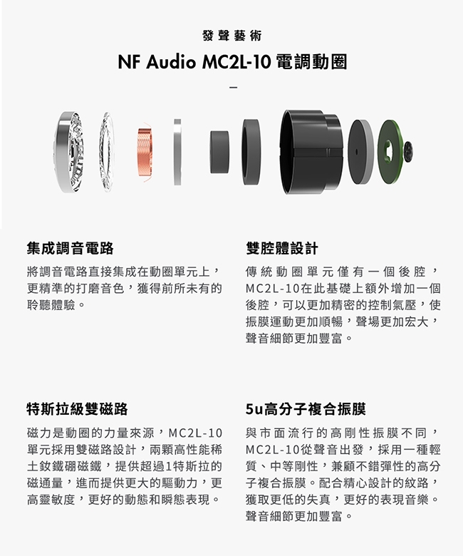 MC2L-10單元採用雙磁路設計,兩顆高性能稀土釹鐵硼磁鐵,