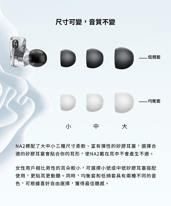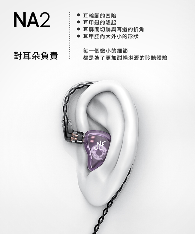 NA2 採用雙磁路雙腔體電調動圈單元,頻寬高達10Hz-40KHz,