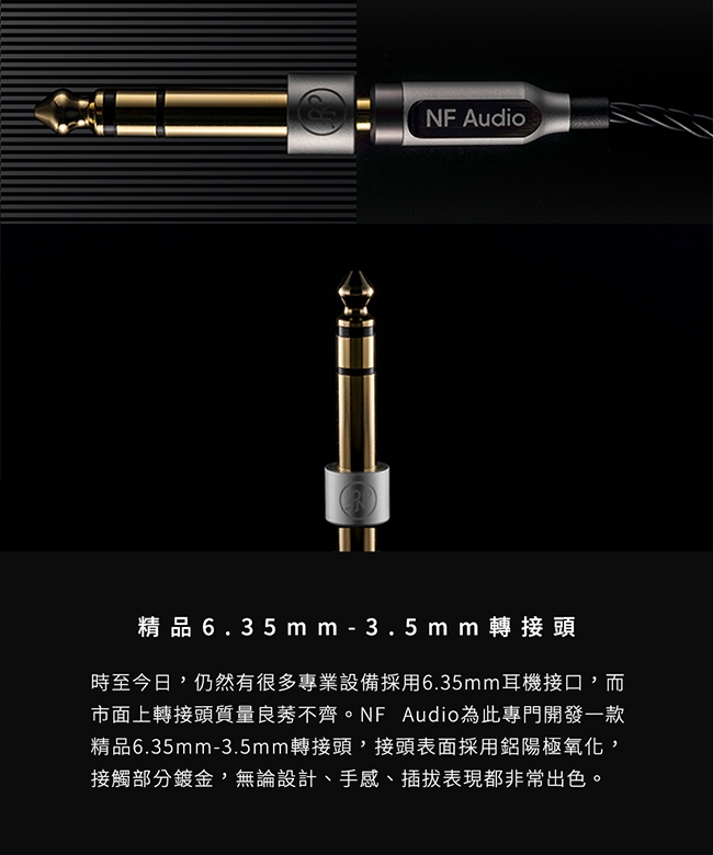 配備6.35mm-3.5mm轉接頭,接頭表面採用鋁陽極氧化,接觸部分鍍金,