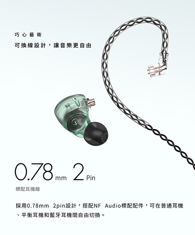 採用0.78mm可換線設計,可另搭配不同的耳機線材或是無線藍牙模組。