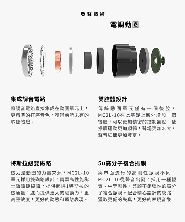 MC2L-10單元採用雙磁路設計,兩顆高性能稀土釹鐵硼磁鐵,