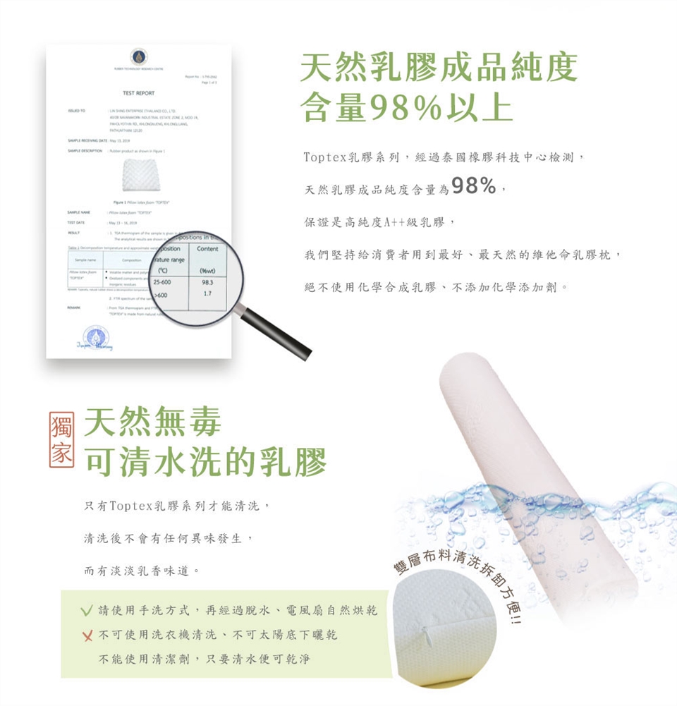 1、天然無添加的乳膠若有需要可清水洗,但不可加入清潔劑,以間隔六個月以上為周期,清洗完畢後室內陰乾,不可曝曬太陽或任何紫外線,以確保乳膠品質- 乳膠枕清洗方式