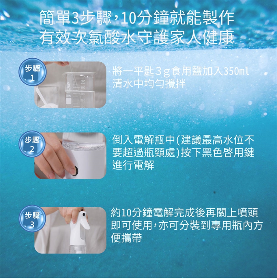 否則影響電極頭及電路板會的壽命。 (建議先在瓶外調好鹽巴水再倒入)