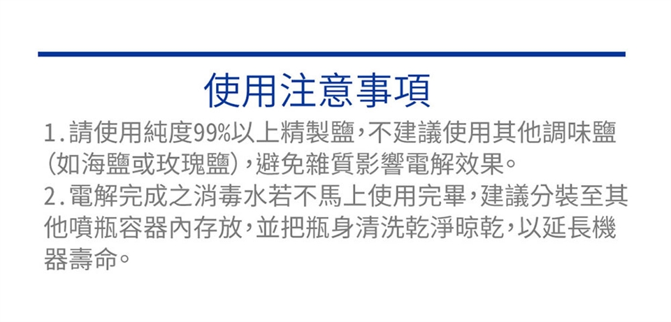 3. 不可再次加入鹽巴,會產生二次化學反應,不可二次電解,