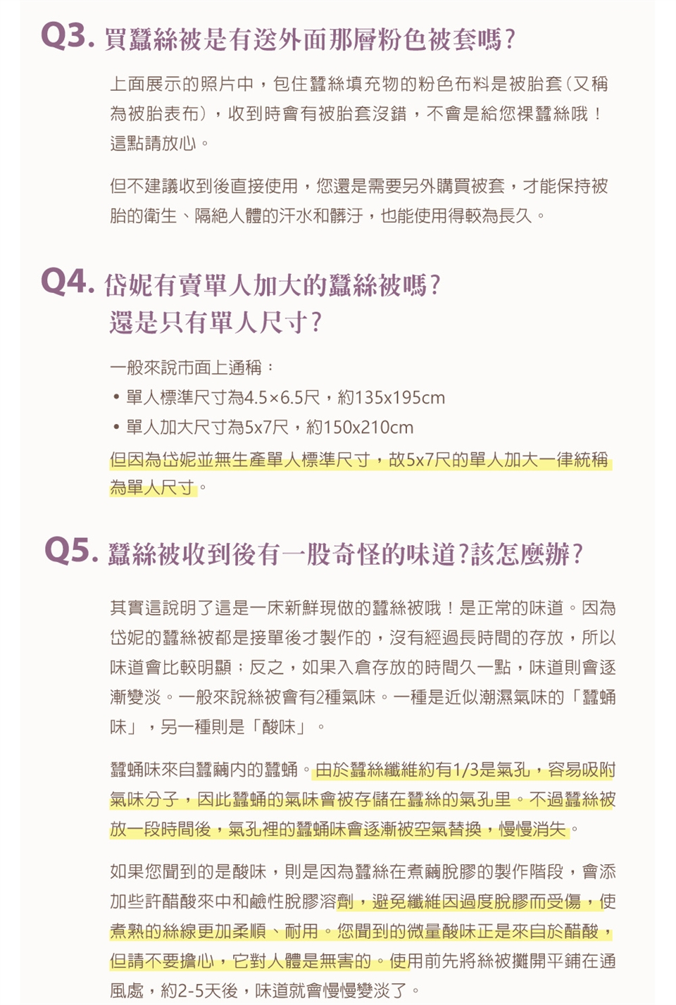 ► 避免放置樟腦丸於被內。避免重壓或用真空收縮袋收納,維持蠶絲內胎結構及蓬鬆度。