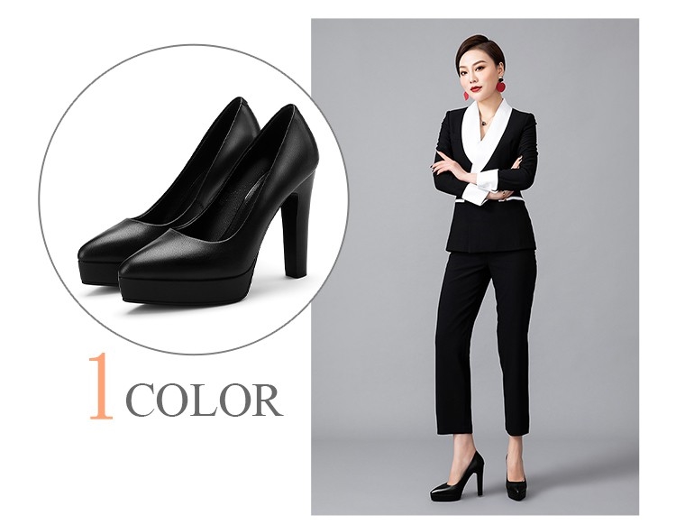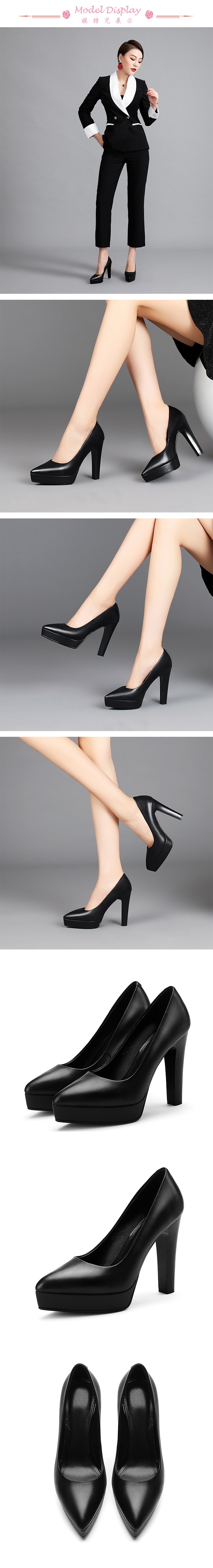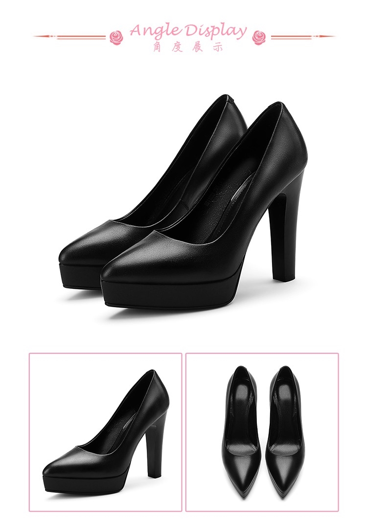 【Kissxxx】真皮頭層牛皮尖頭淺口防水台粗跟11CM高跟鞋 黑