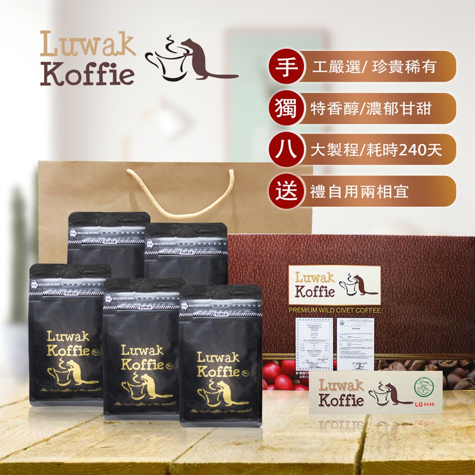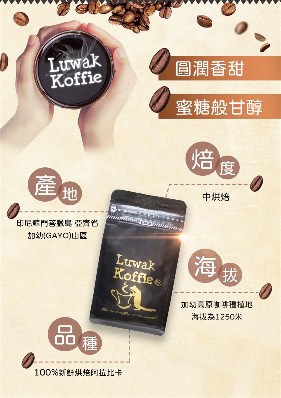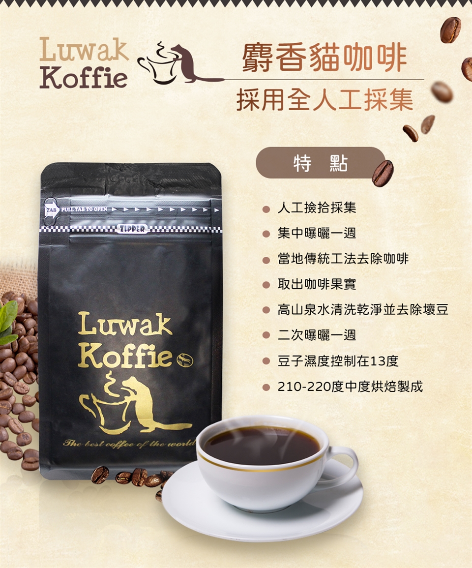 主商品:Luwak Koffie尊爵麝香貓阿拉比卡咖啡豆(100g±3g/包)*4包(不可體驗)