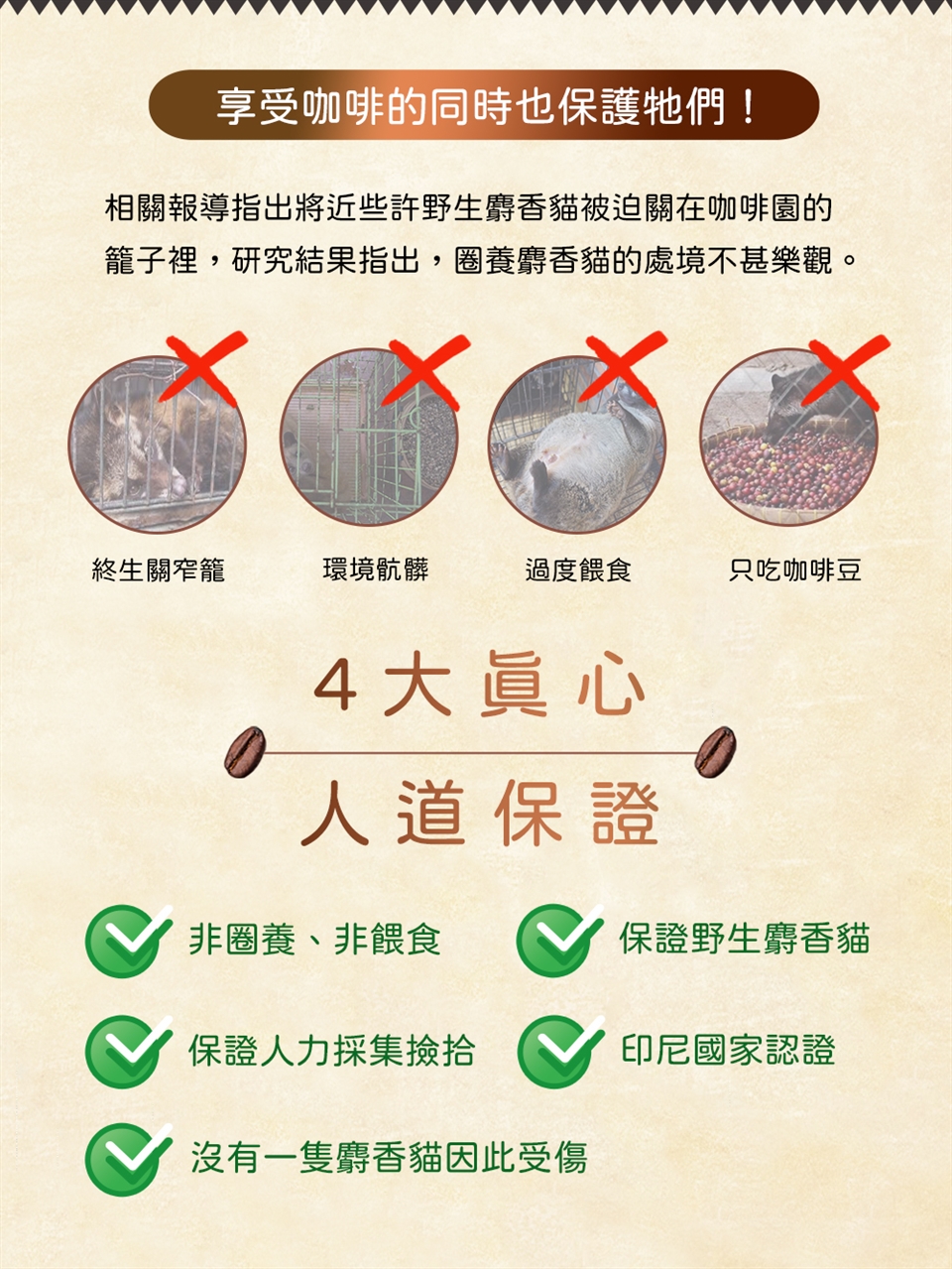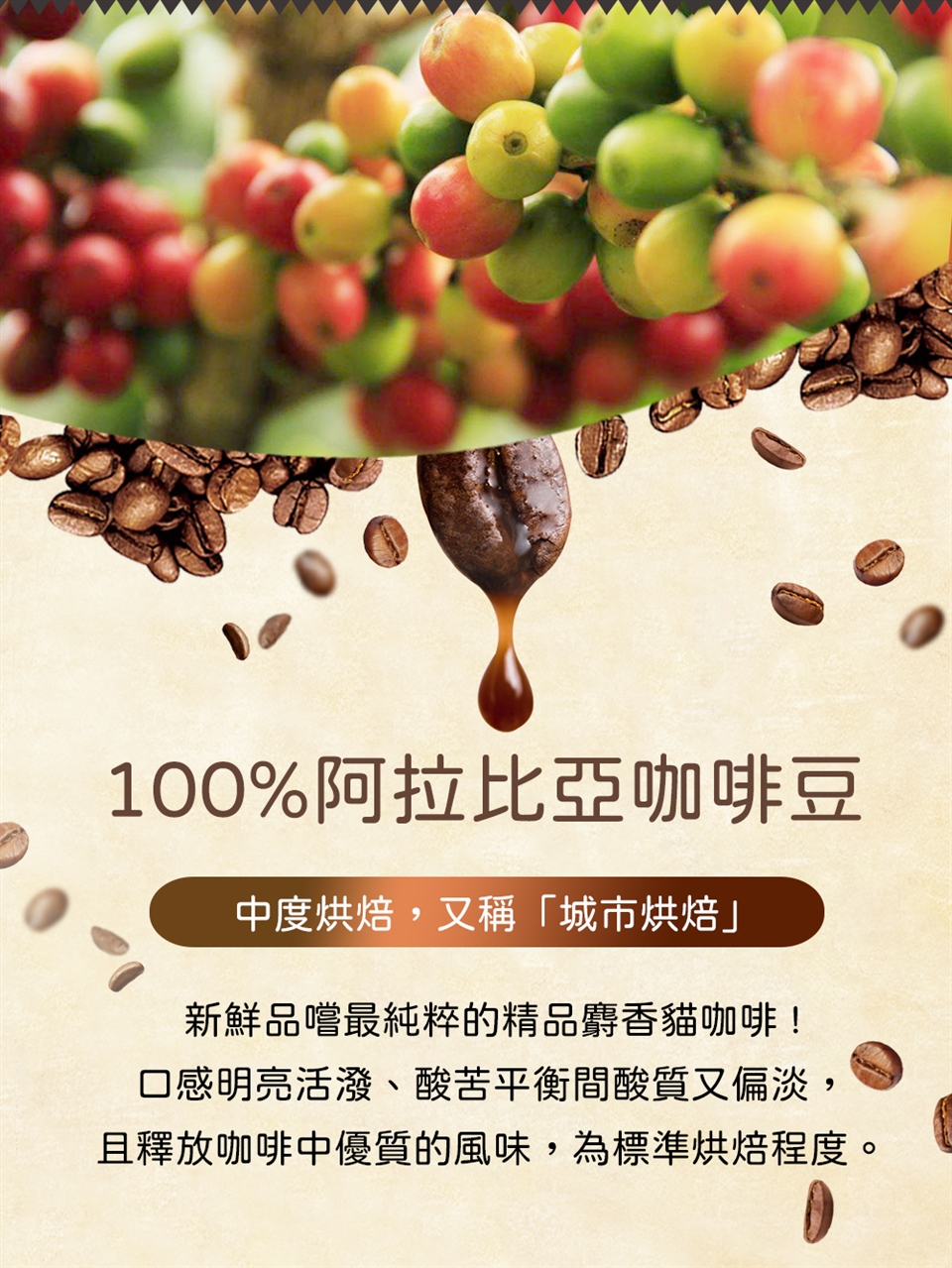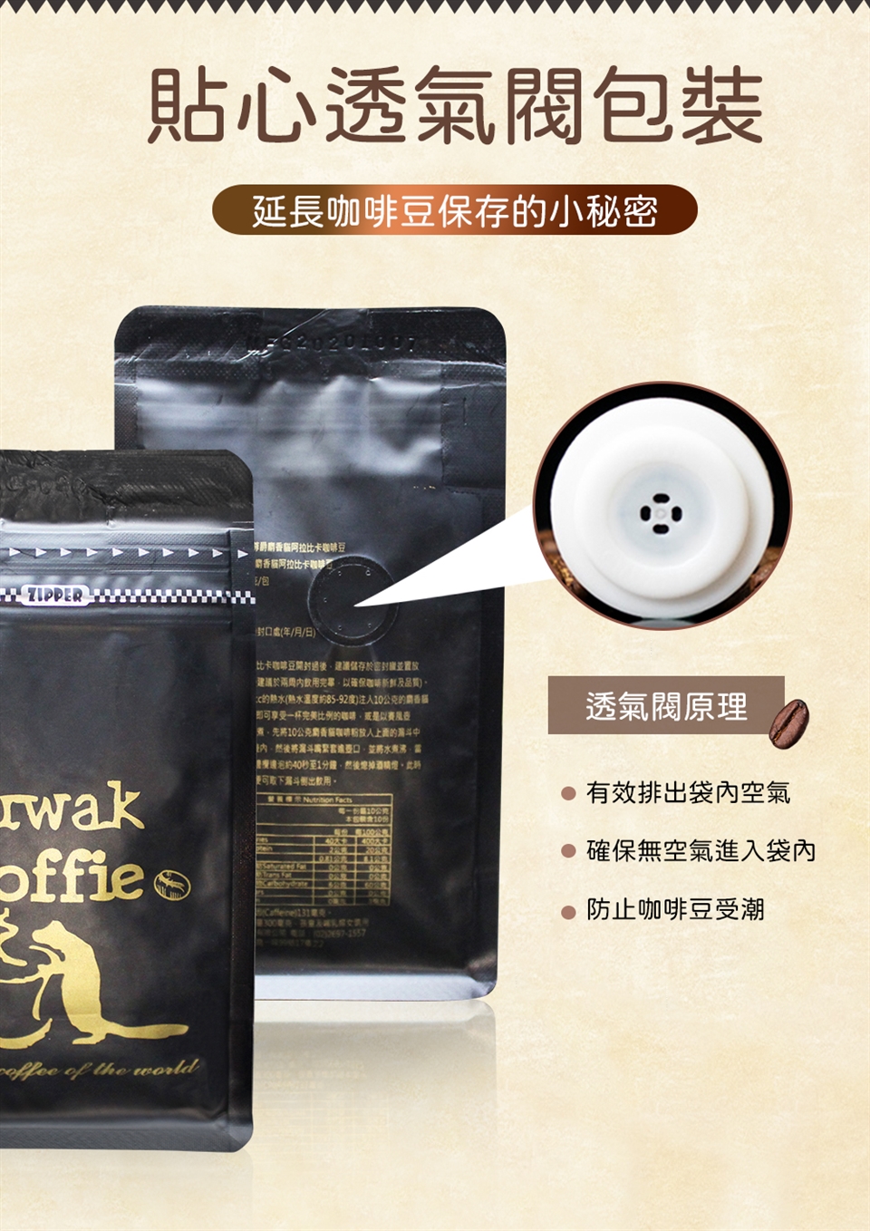 主商品:Luwak Koffie尊爵麝香貓阿拉比卡咖啡豆(100g±3g/包)*4包(不可體驗)