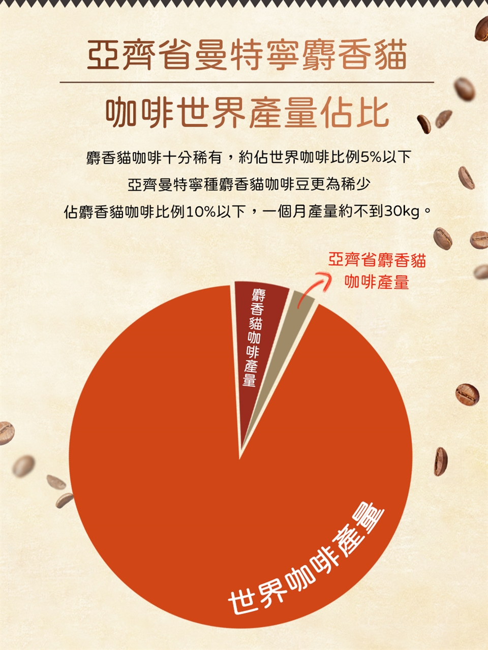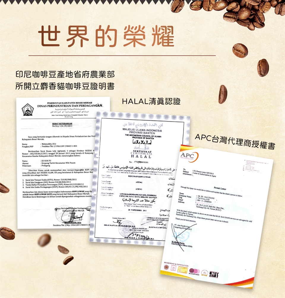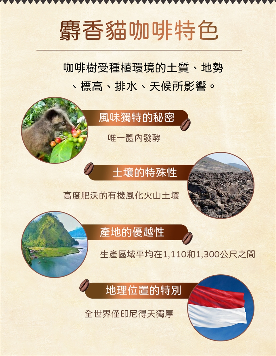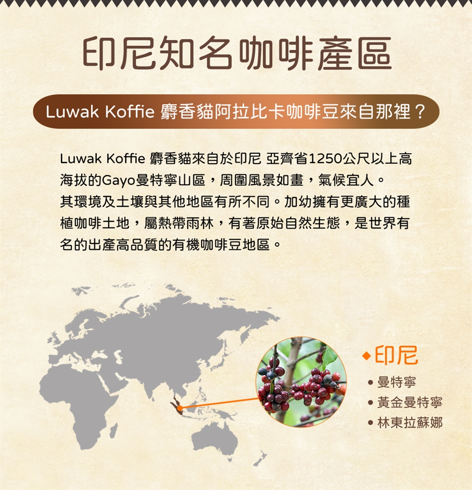 1.在印尼文當中“Kopi”的意思就是咖啡,“Luwak”是印尼人俗稱的“麝香貓”的名字,Kopi Luwak被稱為“尚存品種中最稀有的咖啡”。