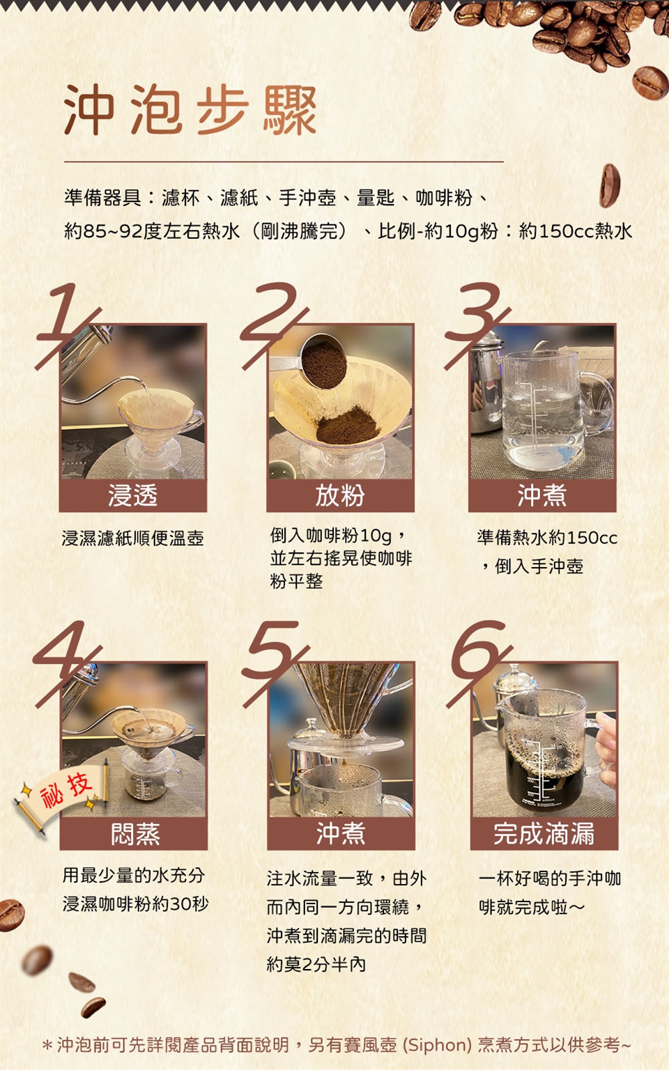 使用方式: 建議將50cc的熱水(熱水溫度約85-92度)注入浸濕全部的麝香貓咖啡粉,等待約30秒,再注入熱水(130cc-150cc)至掛耳濾紙下部浸泡在杯子容器內,等待約一分鐘,取出掛耳濾紙即可享受一杯完美比例的咖啡。
