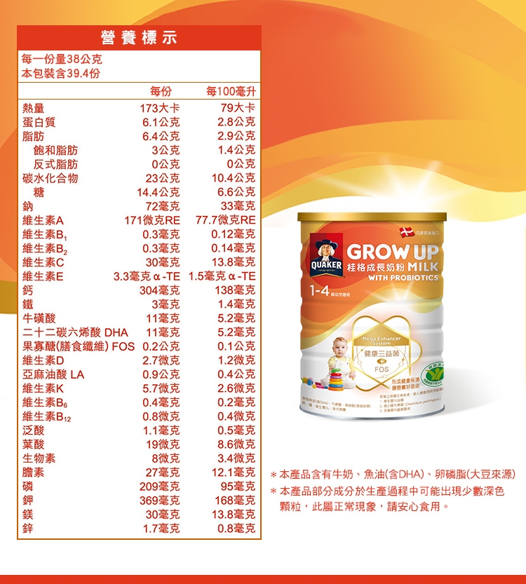 4.內容物名稱(成分):部分脫脂牛奶、麥芽糊精、蔗糖、玉米油、礦物質預混粉 (碳酸鈣、磷酸氫二鉀、磷酸鎂、硫酸亞鐵、硫酸鋅、葡萄糖酸銅)、香草香料、Oligo寡醣(果寡醣)、深海魚油(含DHA)、 維生素預混粉(維生素C、牛磺酸、維生素E、肌醇、菸鹼醯胺、維生素A、維生素D3、本多酸鈣、胡蘿蔔素、維生素B6、 維生素B1、維生素K1、維生素B2、葉酸、生物素、維生素B12)、磷脂質、氯化膽生僉、比菲德氏菌、 嗜乳酸桿菌、酪乳酸桿菌。