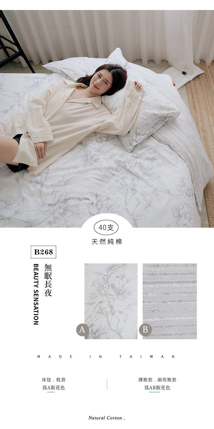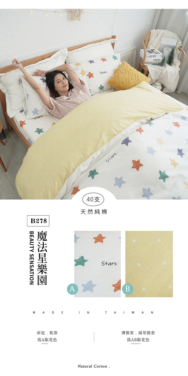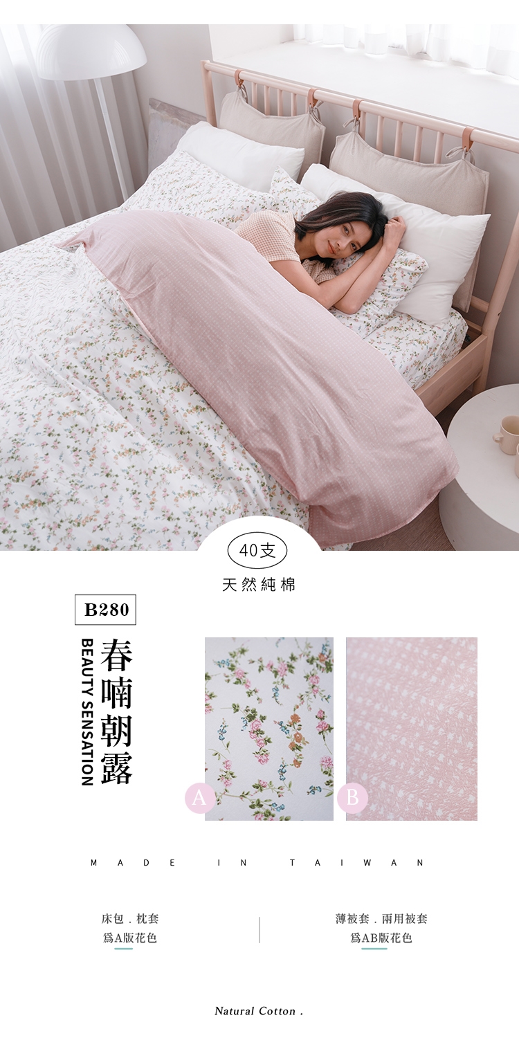 ◆尺寸:雙人床包-5×6.2尺(約150×186公分)/可包覆床墊厚度:約28公分;雙人兩用被套-6×7尺(約180×210公分);美式信封枕套-75×45公分