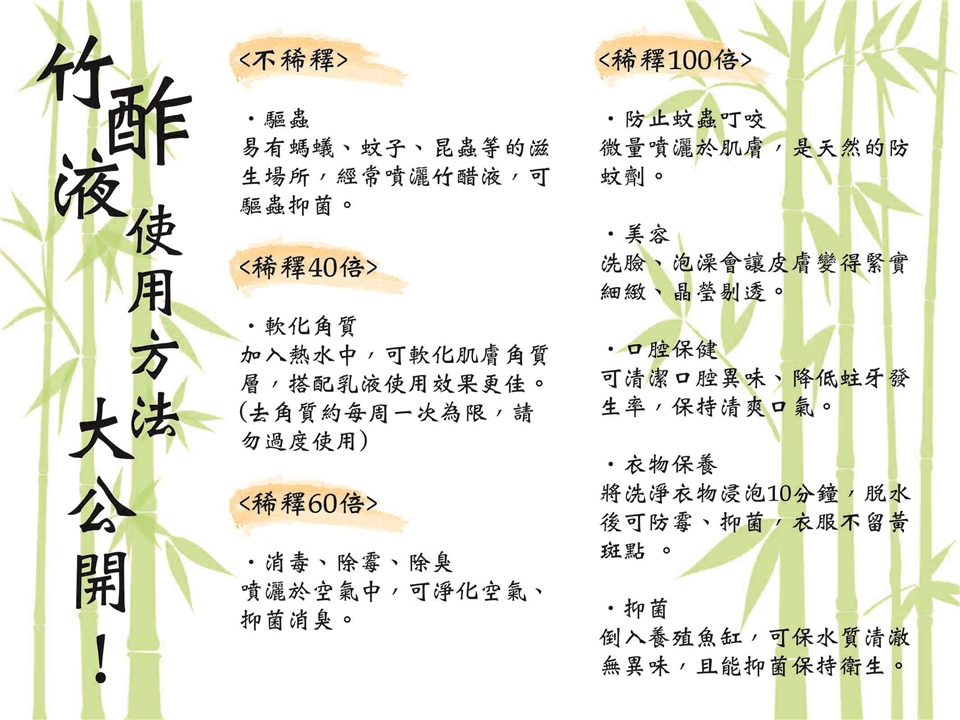 用竹醋液稀釋100倍洗臉、洗澡,會讓皮膚變得緊實細緻、晶瑩剔透。