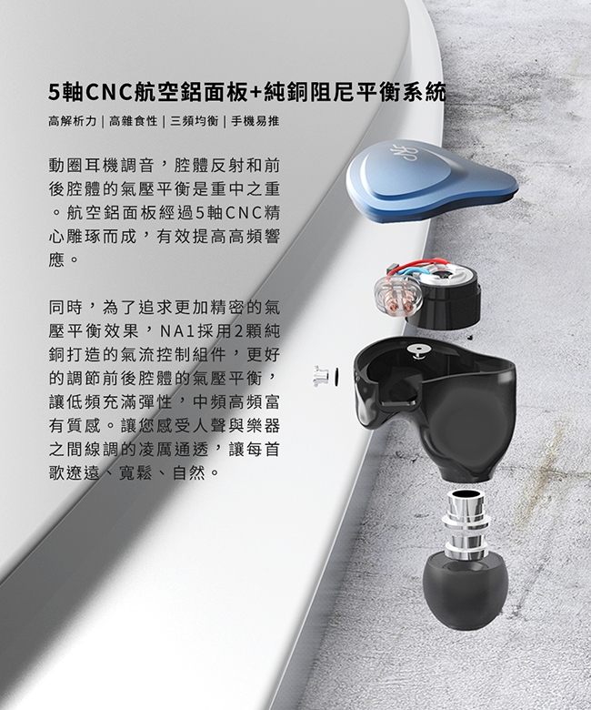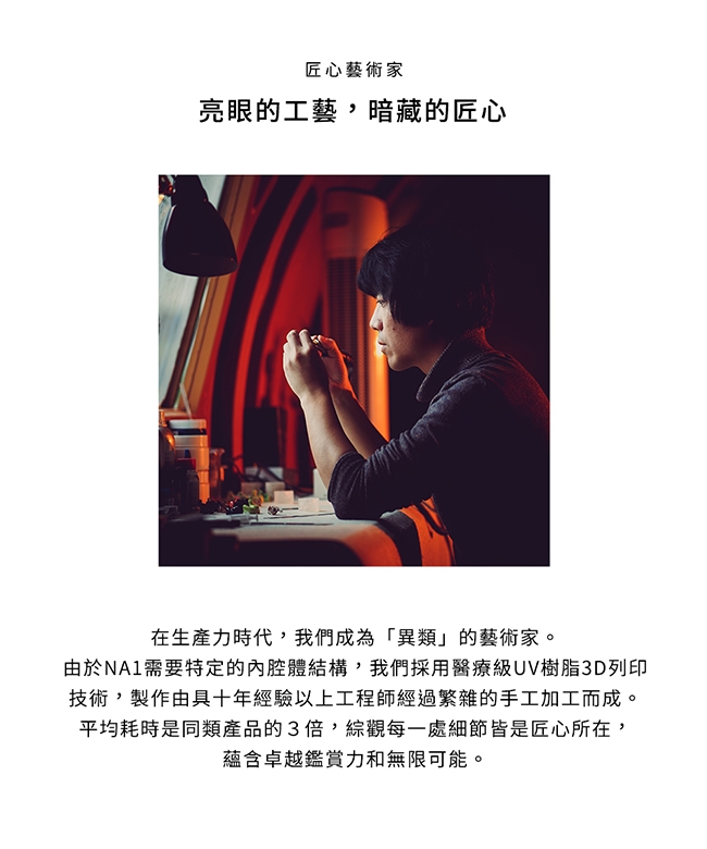 NA1 採用雙磁路雙腔體動圈單元,頻寬達9Hz-40KHz,