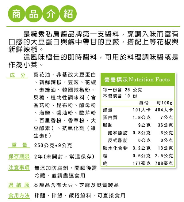 嚴選新鮮無農藥辣椒、豆鼓、上等好油、非基改大豆蛋白,以中火低溫慢炒。