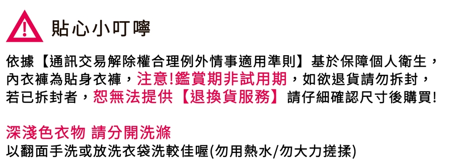 依據消保法第19條第一項規範,個人衛生用品不適用鑑賞期,亦無法試用,故一經拆封將不予退/換貨 (除商品本身有瑕疵外 例:破損、汙漬、缺件...)