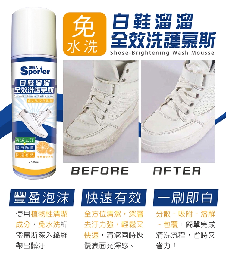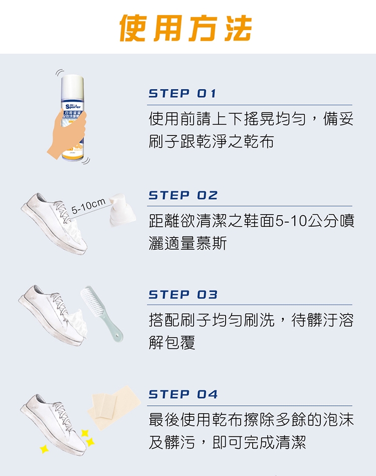 2.距離欲清潔之鞋面5-10公分噴灑適量慕斯