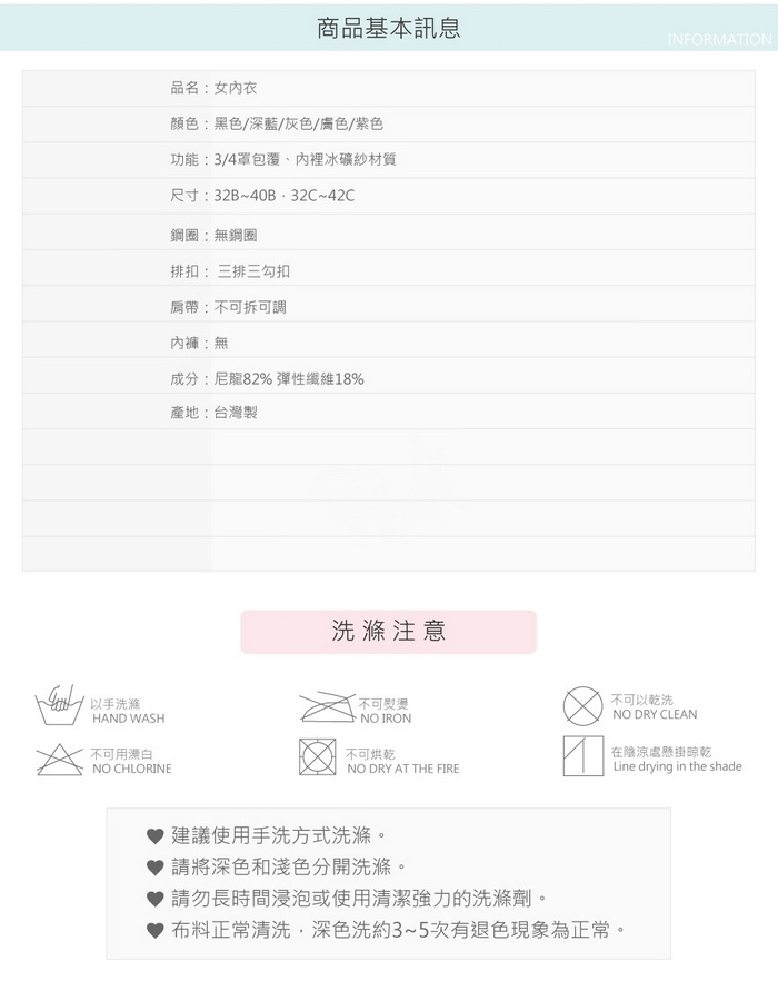 ‧洗滌時建議使用中性洗潔劑手洗,不可長時間浸泡再洗滌。