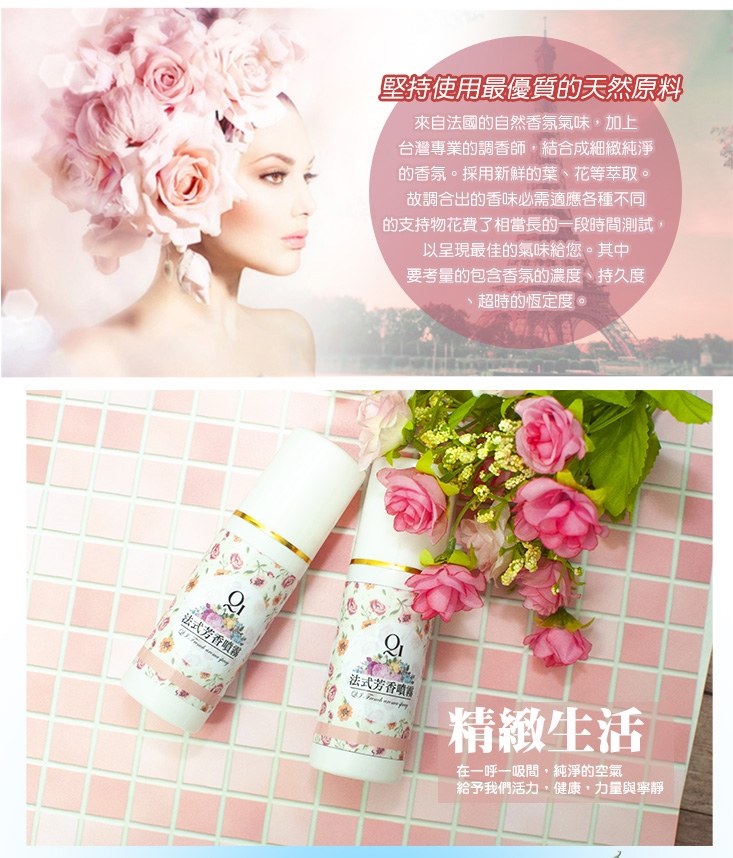嚴選法國頂級香氛精油調製而成,法式空氣衣物香水噴霧,不管是廁所、鞋櫃、養寵物空間或是吃完火鍋、燒烤、吸菸身上殘留的難聞氣味,都可以用衣物噴霧清除喔,不僅去除味道,而且還留有淡淡清香唷!