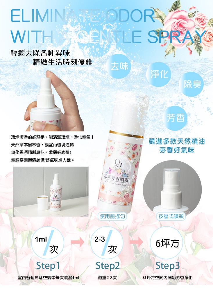 可以噴的地方非常多,車子、房間、客廳、廚房、辦公室、廁所、餐廳、衣櫥、鞋櫃、櫃子...等等等,也可以直接噴在身上唷,噴完讓人馬上有好心情,隔壁同事或室友、老公的鞋子臭臭的流汗好噁心...噴一下立刻香噴噴一整天!!