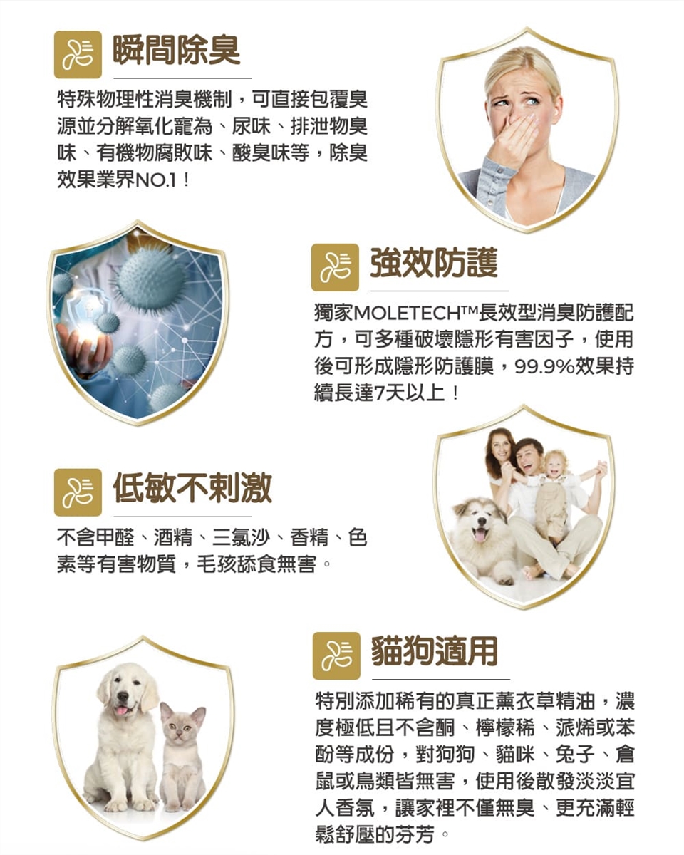 成 分: 去離子水、MOLETECH™長效型消臭防護配方、聚山梨醇酯20、寵物友善級天然精油(低於1%)