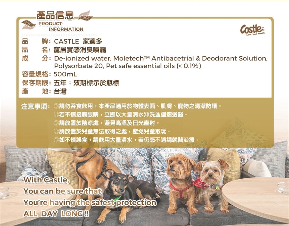 #Castle家適多 #寵居實感消臭噴霧 #除臭噴霧 #天然植萃 #寵物友善 #居家除味 #貓狗共用 #無酒精 #無化學香精 #MOLETECH科技 #長效防護 #空氣清新 #淨味防護 #尿味除臭 #體味清新 #居家清潔 #寵物家庭必備 #台灣製造 #CastleClean #家適多