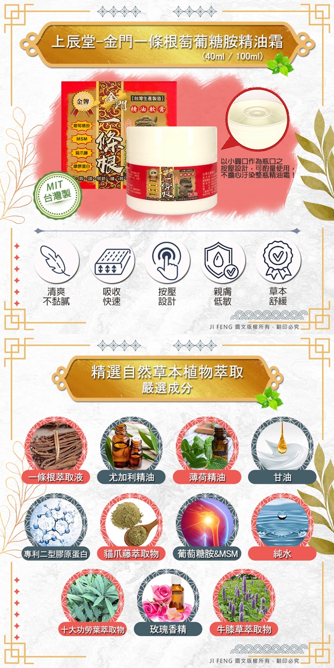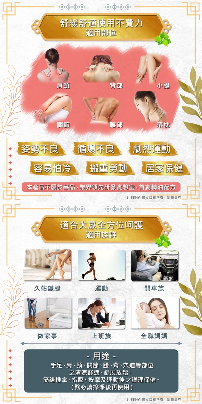 抹取適量的精油霜,每日1~3次,反覆按摩。