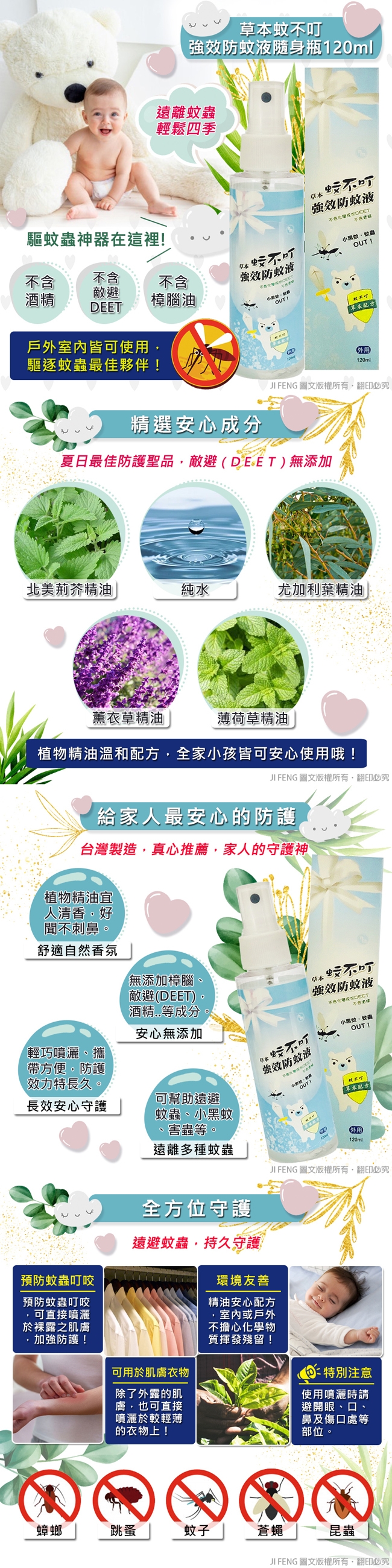 6.不含化學成份DEET(敵避)、酒精、樟腦等成份,大人小孩均可安心使用。
